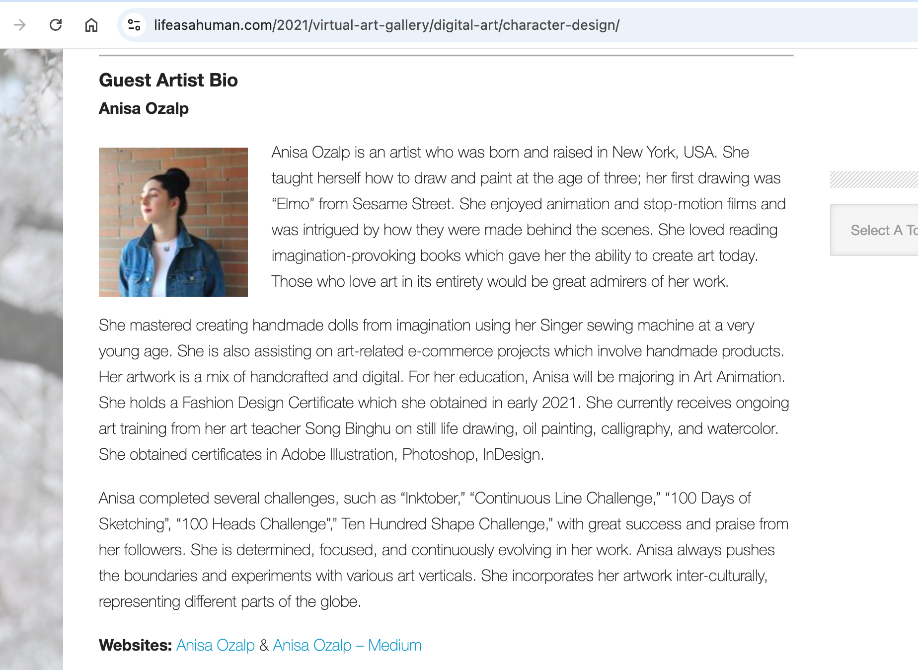 Anisa’s guest-artist piece “Character Design” for Life As A Human’s Virtual Art Gallery (June 9, 2021) highlights works like “Sensei Vision,” an original Naruto-inspired figure, and “Spirit of Dragon Fruit,” using symbolism, cultural references, and digital techniques to explain her character-design choices. Life As A Human is an online human-interest magazine guided by the motto “evolving minds,” publishing multi-author essays on art, personal growth, travel, and relationships to spark reflection on what it means to be human. Read the article at: https://lifeasahuman.com/2021/virtual-art-gallery/digital-art/character-design/