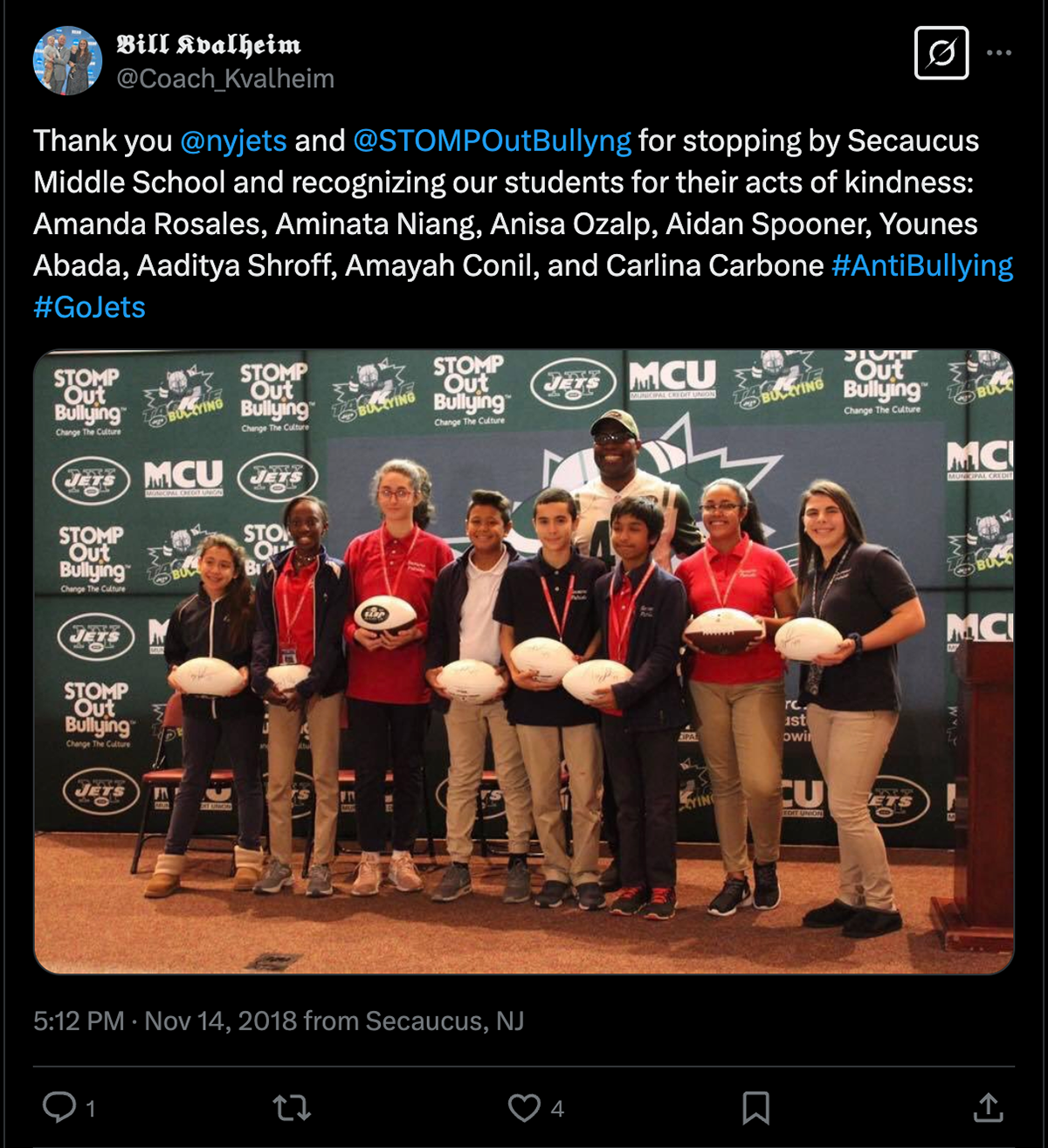 Anisa Ozalp has been recognized for outstanding acts of kindness during a special event at Secaucus Middle School, organized in collaboration with STOMP Out Bullying and the New York Jets. This initiative aimed to honor students who demonstrated compassion, leadership, and a commitment to fostering a positive and inclusive school environment.