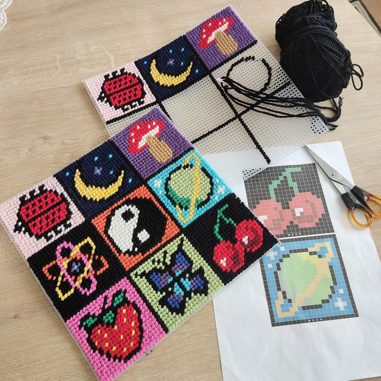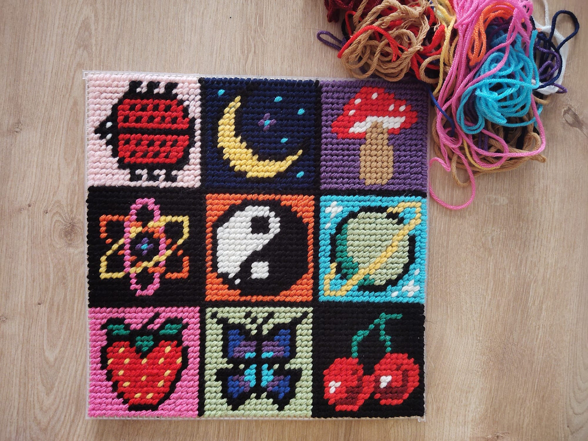 Plastic canvas: Plastic canvas is a craft material of lightweight plastic with regularly spaced holes in imitation of embroidery canvas. Plastic canvas can break easily, especially when used as a bag. Keep in mind this should be for more decorative purposes. You can also consider combining all of the squares to be used as wall art instead. Just like an old tapestry!