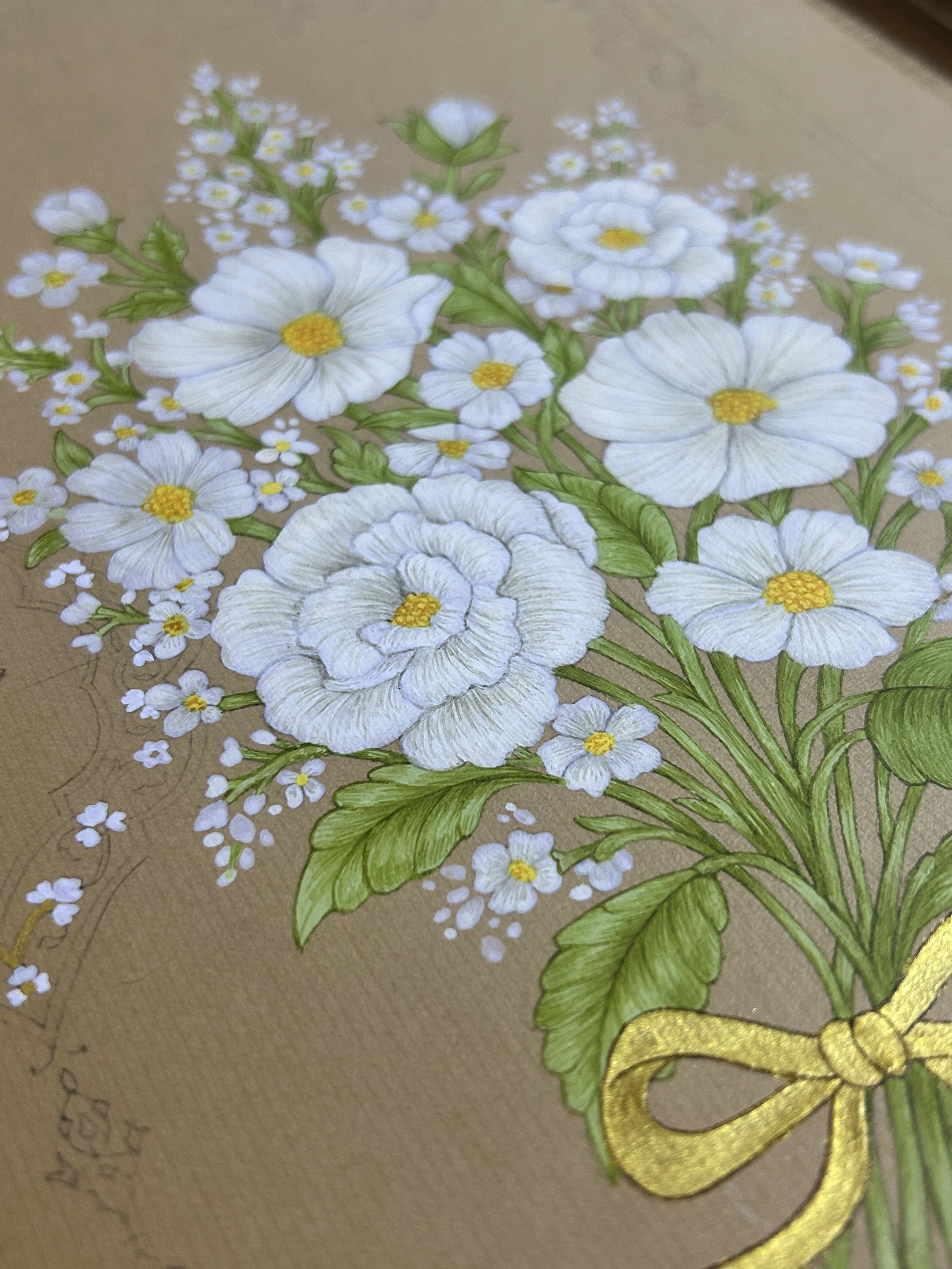 To the right, a bouquet of white flowers blooms in a style inspired by Shukufe method and miniature painting, softened by personal expression. I painted white roses and cosmos with golden-yellow centers, surrounded by chamomile-like blossoms for texture and a sense of humility. Green stems and leaves are tied with a golden ribbon, forming a gesture of offering.