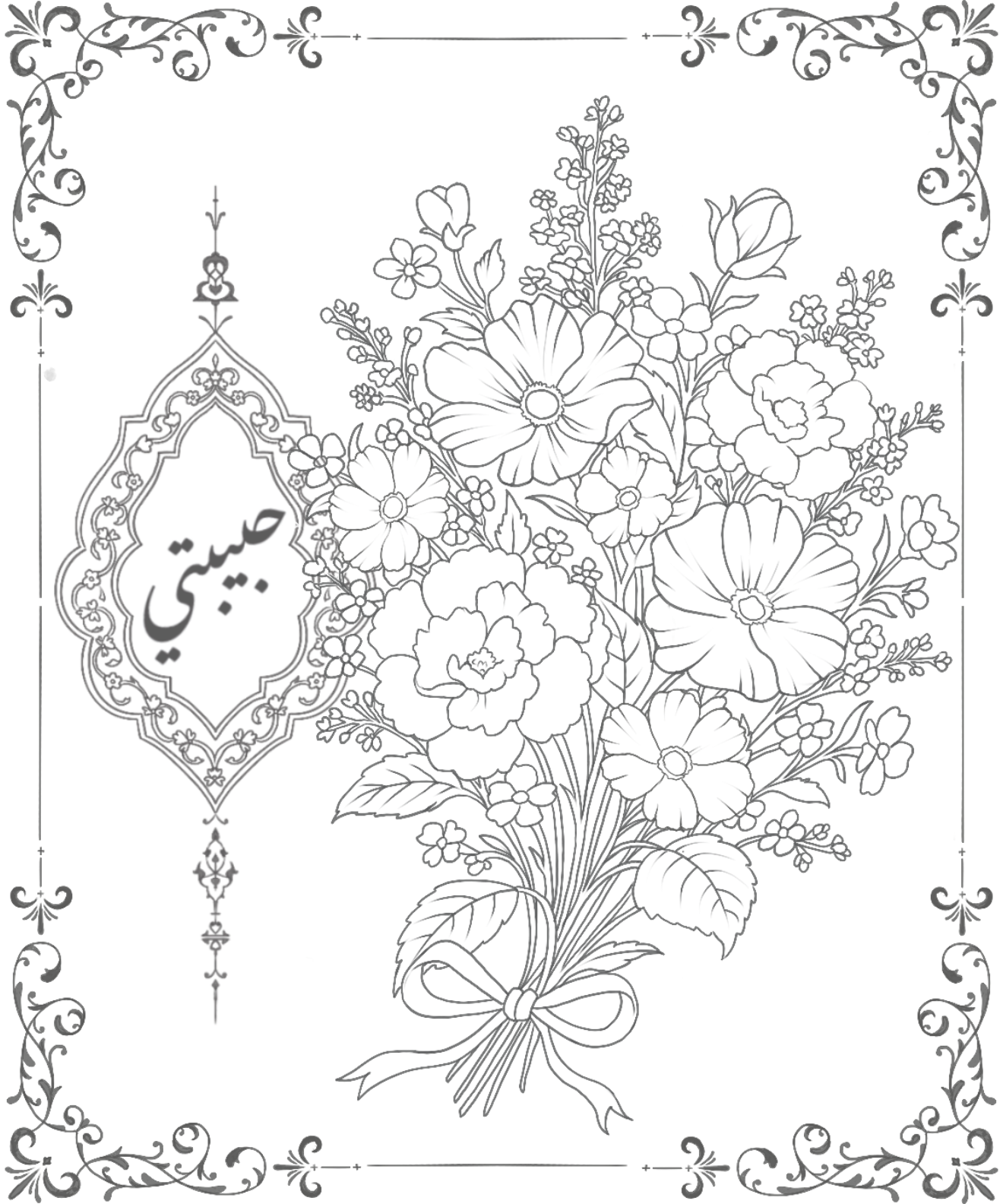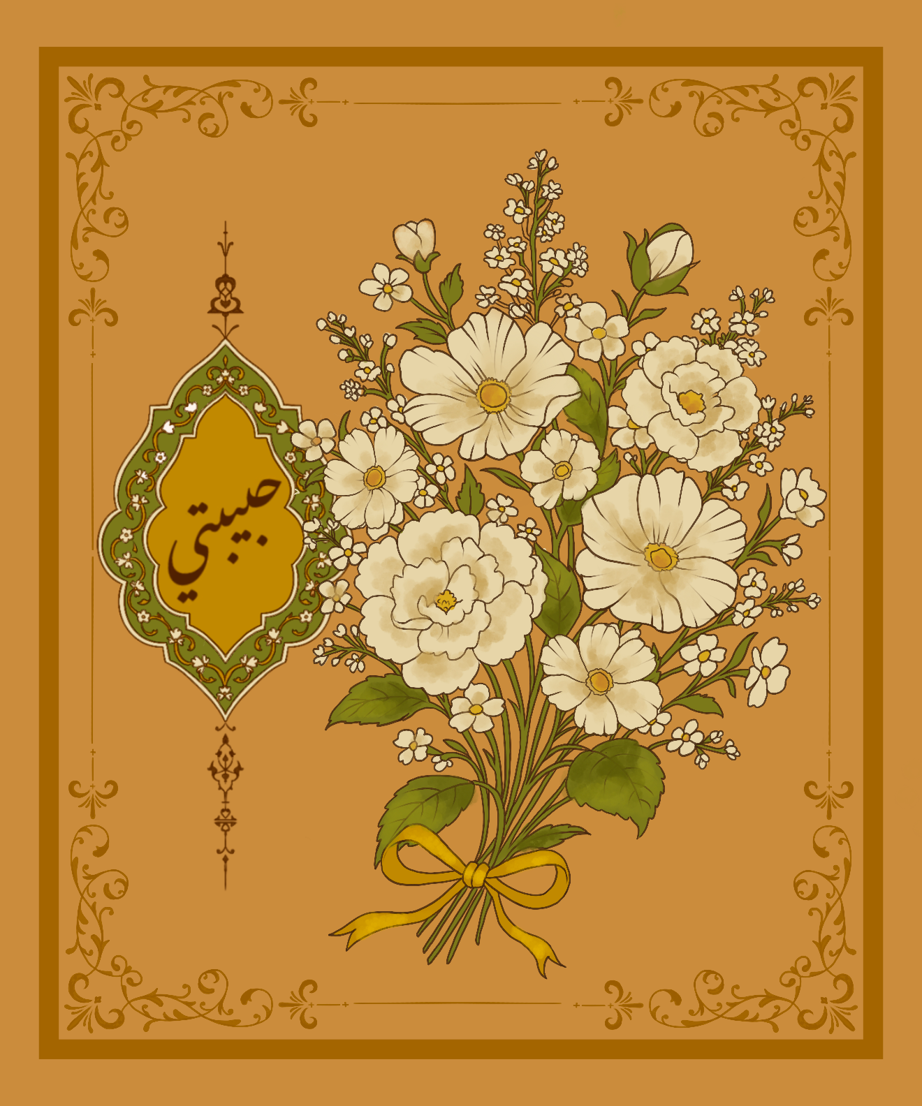 In this work, I centered the Arabic word "حبيبتي" (Habibti)—my beloved—as both anchor and offering. The calligraphy is set in a vertical medallion inspired by classical manuscripts, against a gold ground enclosed in an olive green frame with white floral motifs, evoking gentleness and devotion. A black ornamental finial extends the form above and below, rooting it in tradition.