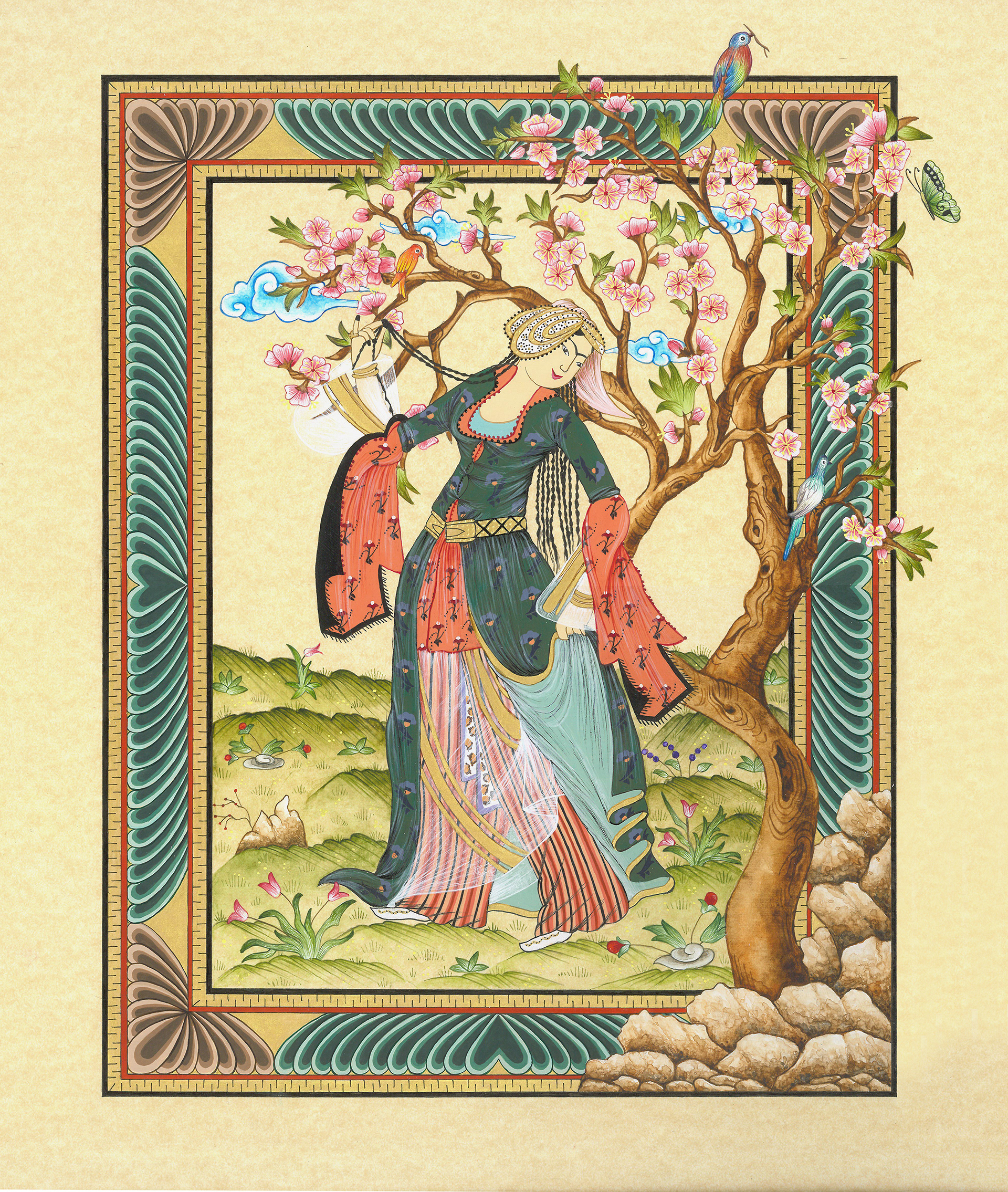 "The Heavenly Dream of Levni" is a project that honors women's empowerment during the Ottoman Tulip Era, a time known for its cultural outreach and the elite's fascination with tulips. The artwork is inspired by Levni, the Tulip Era's celebrated master of miniature and realistic painting, specifically recreating his piece "Women in Attire." Enhancements include a spring-themed backdrop with pink blossoms and a "Munhani" style border featuring curvilinear motifs.