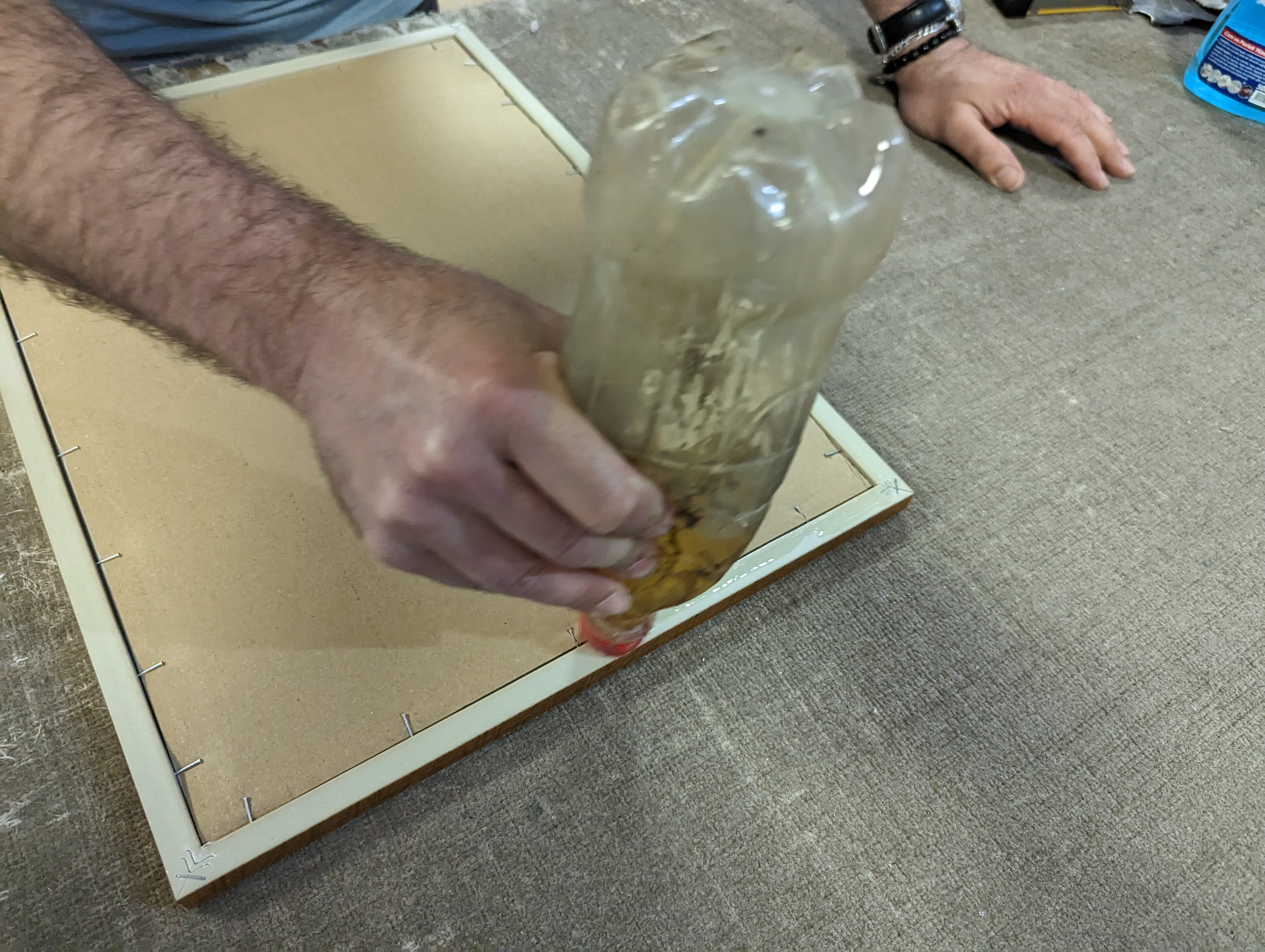18. Once the gold particles are well-distributed in the water, carefully pour off any excess water, leaving the gold particles in the smaller dish.