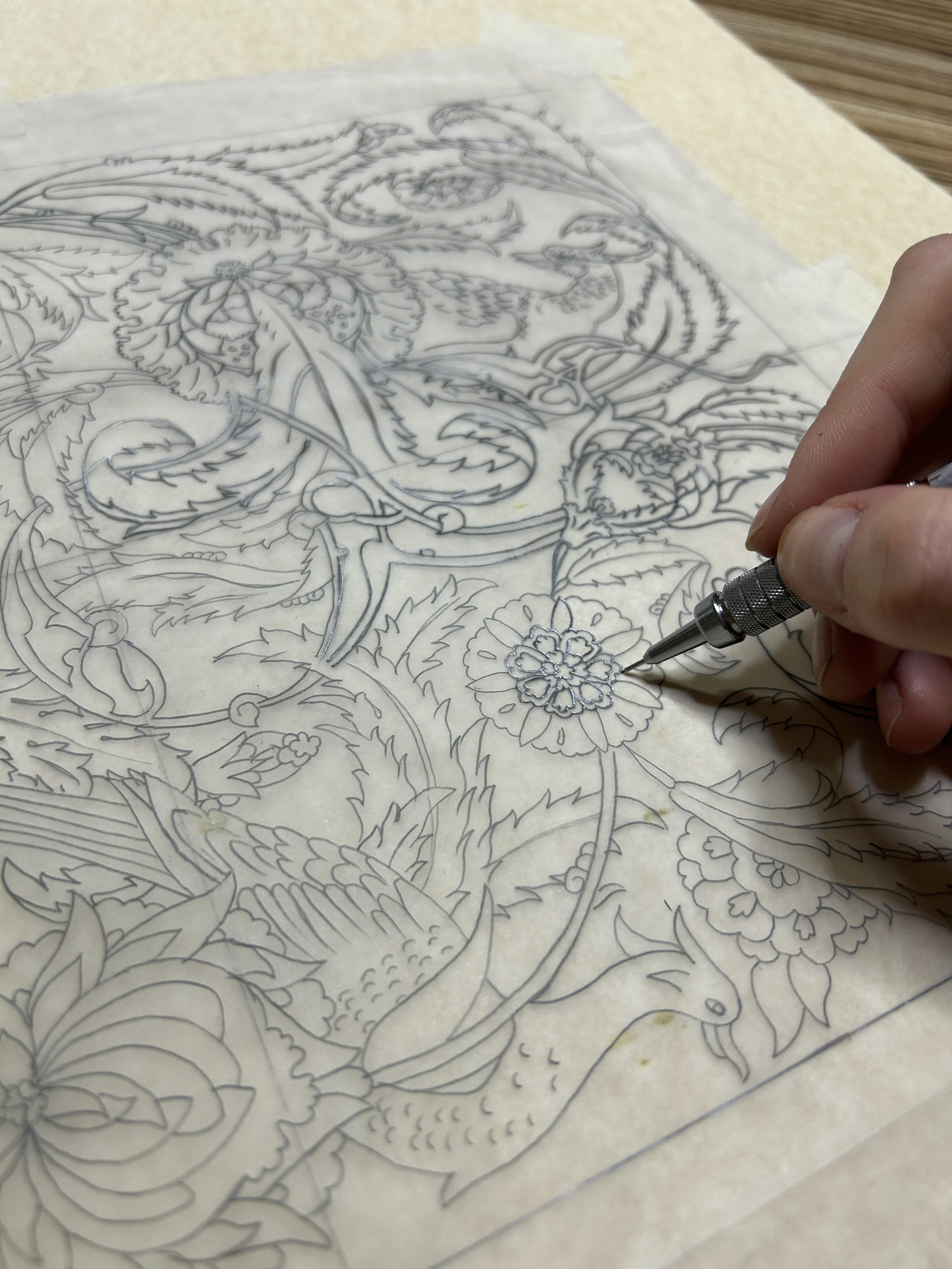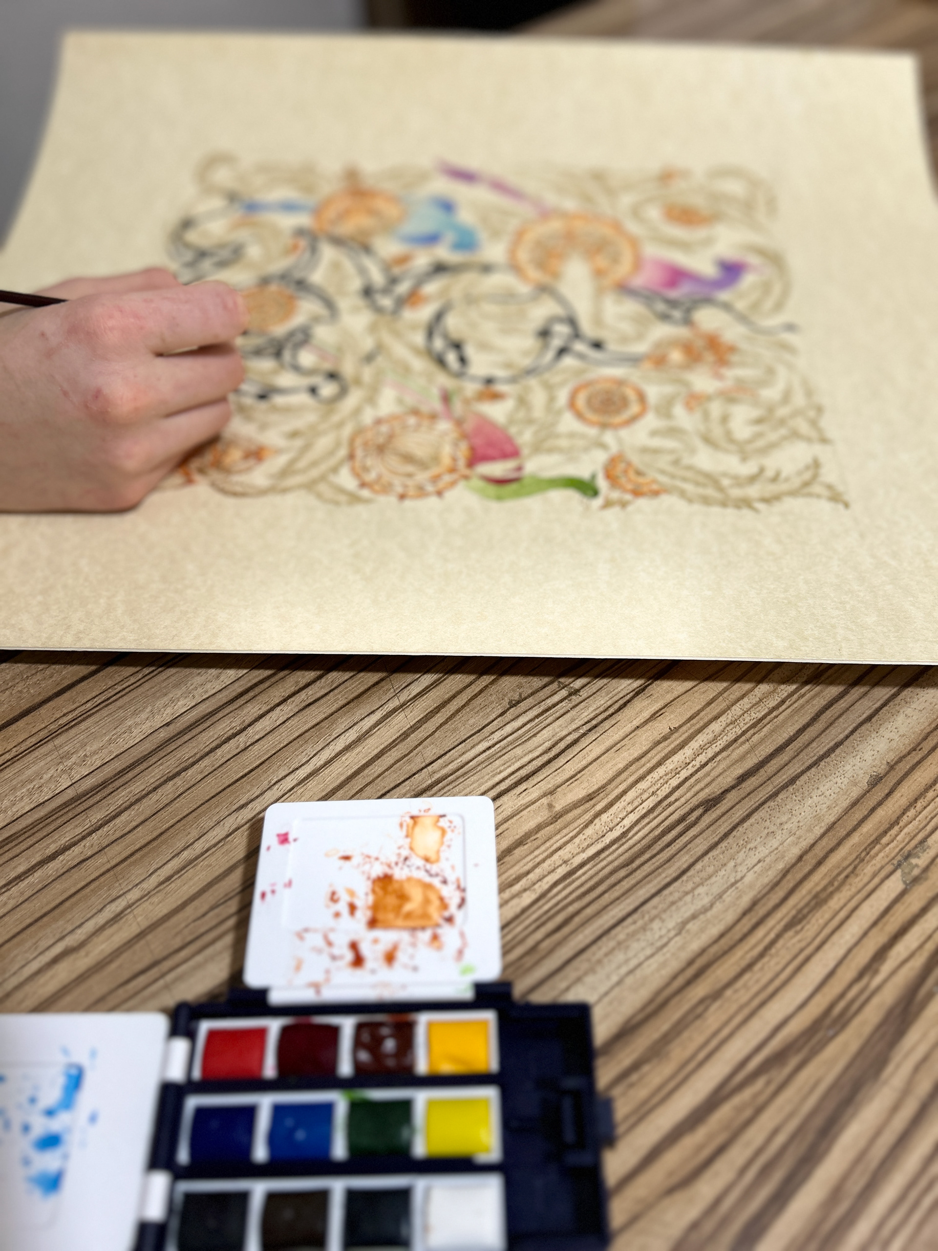 This wallpaper design process is inspired by archaic tradition, reflecting intricate geometric patterns, birds, and floral motifs. The overall effect is luxurious, sophisticated, and culturally rich, making it a suitable addition to your artistic wallpaper portfolio. Below is the making process, including sketches, mood boards, or initial drafts to illustrate my creative process.