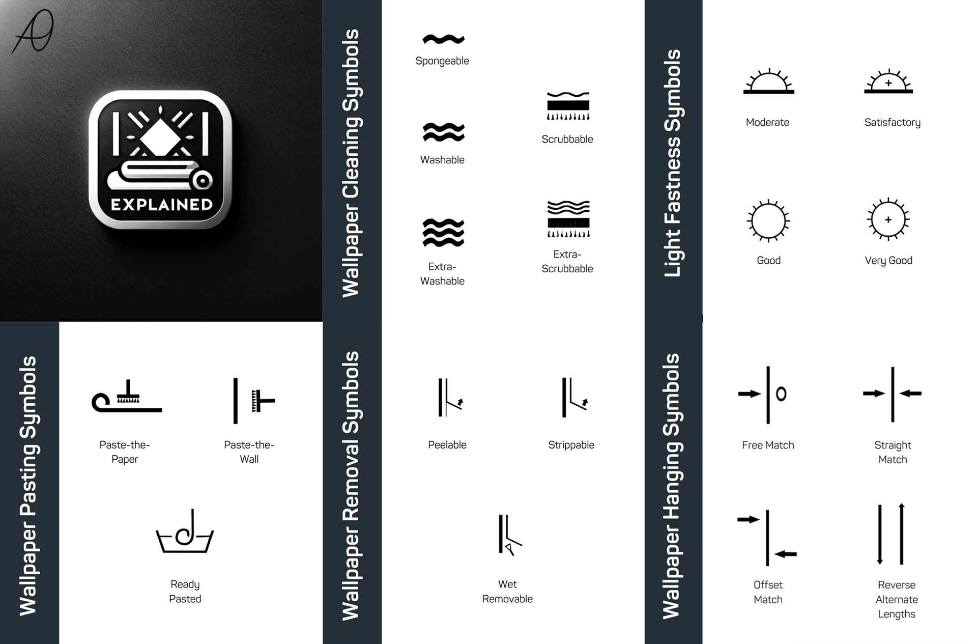 Wallpaper symbols guide cleaning methods, light fastness, pasting techniques, removal process, and pattern alignment, helping choose suitable wallpapers based on their maintenance and aesthetic qualities.