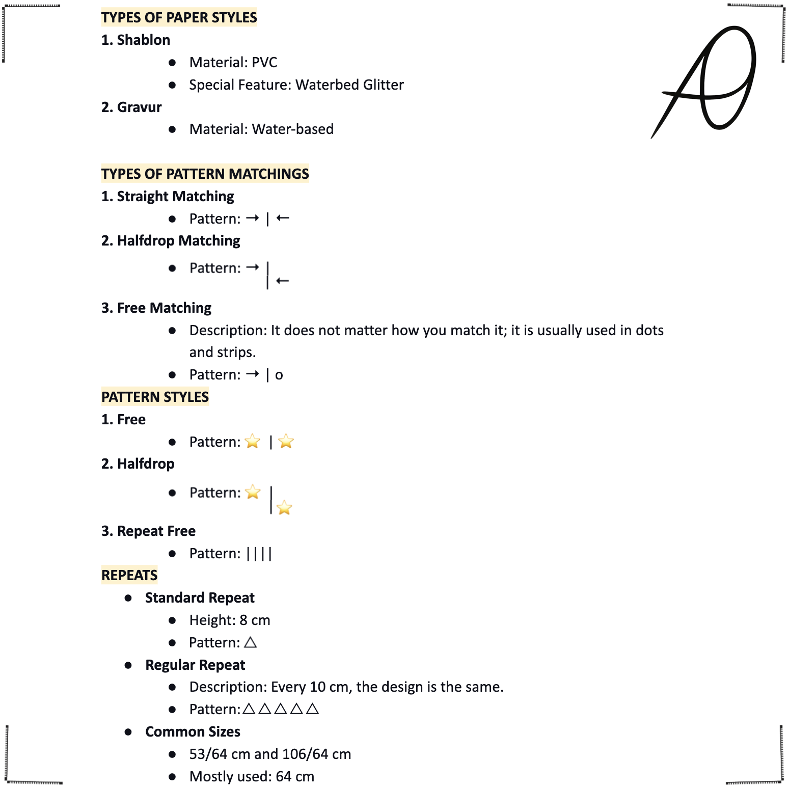 *Paper Styles: 1. Shablon (PVC, Waterbed Glitter), 2. Gravur (Water-based); Pattern Matchings: 1. Straight Matching (Pattern: → | ←), 2. Halfdrop Matching (Pattern: → |, | ←), 3. Free Matching (Dots and strips, any match); Pattern Styles: 1. Free (⭐ | ⭐), 2. Halfdrop (⭐ |, | ⭐), 3. Repeat Free (||||); Repeats: Standard (8 cm △), Regular (Every 10 cm △△△△△), Common Sizes (53/64 cm, 106/64 cm, mostly 64 cm)